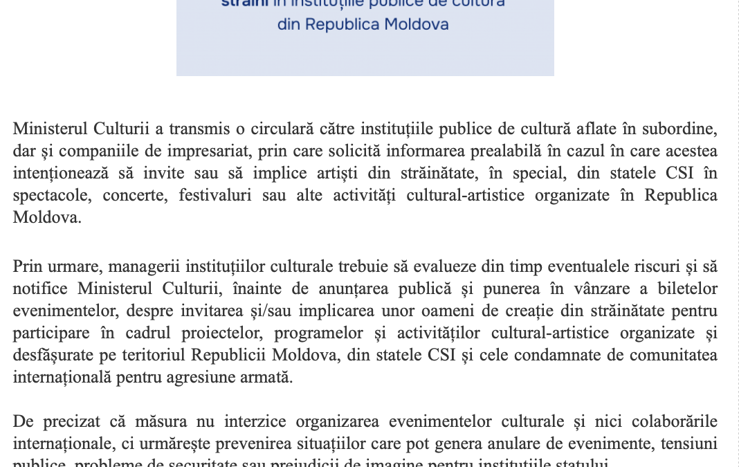 Ministerul Culturii a transmis o circulară către instituțiile publice de cultură aflate în subordine, dar și companiile de impresariat, prin care solicită informarea prealabilă în cazul în care acestea intenționează să invite sau să implice artiști din străinătate, în special, din statele CSI în spectacole, concerte, festivaluri sau alte activități cultural-artistice organizate în Republica Moldova. Prin urmare, managerii instituțiilor culturale trebuie să evalueze din timp eventualele riscuri și să notifice Ministerul Culturii, înainte de anunțarea publică și punerea în vânzare a biletelor evenimentelor, despre invitarea și/sau implicarea unor oameni de creație din străinătate pentru participare în cadrul proiectelor, programelor și activităților cultural-artistice organizate și desfășurate pe teritoriul Republicii Moldova, din statele CSI și cele condamnate de comunitatea internațională pentru agresiune armată.”